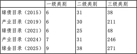 如果与第一版、第二版的绿色债券目录相比,这版《目录》的条目数增加就更显著了:一级类别从此前的6个增加到9个,二级类别从此前的25个增加到38个,三级类别从此前的48个增加到271个。这一增长的主要原因是这版《目录》兼顾了绿色债券和绿色信贷这两种应用场景,实现了一个《目录》既能用来识别绿色债券支持项目,也能用来识别绿色贷款支持项目。在此之前,这是两套统计分类的方法:绿色债券支持项目是依据第一版和第二版的绿色债券目录来识别的,绿色贷款则是依据中国人民银行和金融监管总局制定的统计制度来识别、统计和保送;绿色债券目录是公开文件,绿色贷款的统计制度则是由监管部门直接发给商业银行,而且中国人民银行和金融监管总局的统计制度此前还略有差异。因为绿色信贷的规模比绿色债券的规模大很多,所以这份《目录》就必然要大幅度扩容。扩容之后,《目录》的名称也从《绿色债券项目支持目录》修改为《绿色金融项目支持目录》。