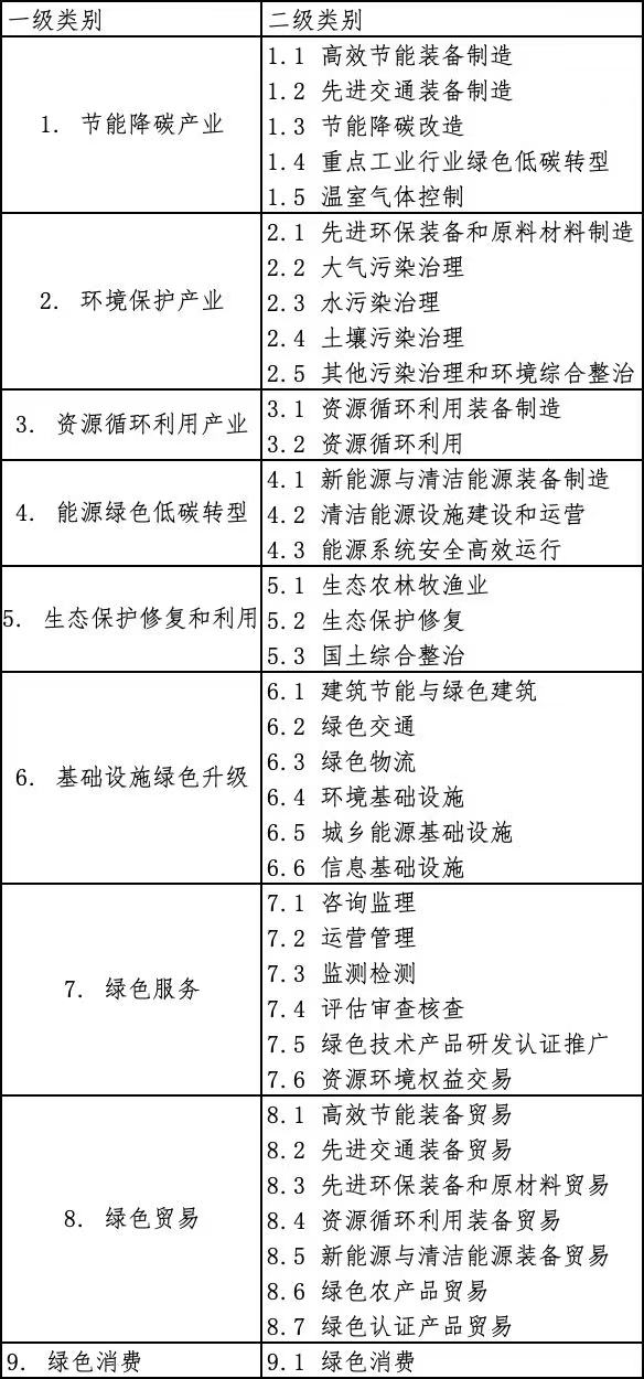 从结构上看,《目录》按领域分为一级、二级和三级等三种类别。一级类别涵盖9个领域,9个领域又可以分为两种类型。一种是实体产业属性的,包括:节能降碳、环境保护、资源循环利用、能源绿色低碳转型、生态保护修复和利用、基础设施绿色升级等6个领域;另一种是服务贸易属性的,包括:绿色服务、绿色贸易和绿色消费等3个领域。这9个一级类别进一步细分为38个二级类别和271个三级类别。三级类别再往下是按国民经济行业类别划分的具体条目,约1000个条目,多数附上了对应的国民经济行业代码。